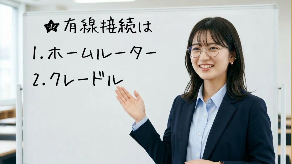 - 有線接続の方法は「ホームルーター」か「クレードル(モバイルルーター)」の2択